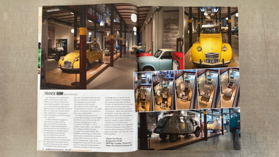 ‘Classic Car House – et dansk bilmuseum med en samling på 300 smukt iscenesatte biler – fejrer bilen, dens historie og de ikoniske brands. I hjertet af den dobbelthøje udstillingssal, som er dedikeret forholdsvis almindelige bilmodeller, troner en spektakulær installation, der hylder 2 CV’ens geniale konstruktion. Installationen, som designstudio KVORNING har skabt til stedet, viser en 2 CV, hvis komponenter hæves og sænkes mellem etagerne ved hjælp af et raffineret system af kabler og motoriserede taljer. På få sekunder forvandles den lille Citroën til et ‘exploded view’, som man kender det fra fx manualer, og samles igen i én uafbrudt bevægelse.’ Ref.: FRANSK GENI [Génie français], Planète 2 CV No 152, Janvier – Mars 2026.