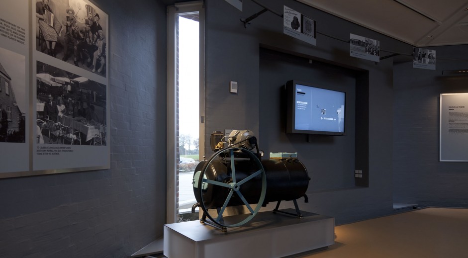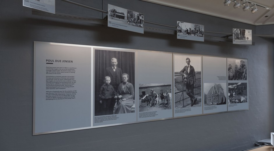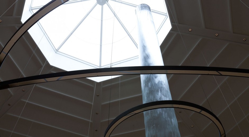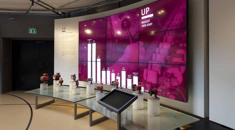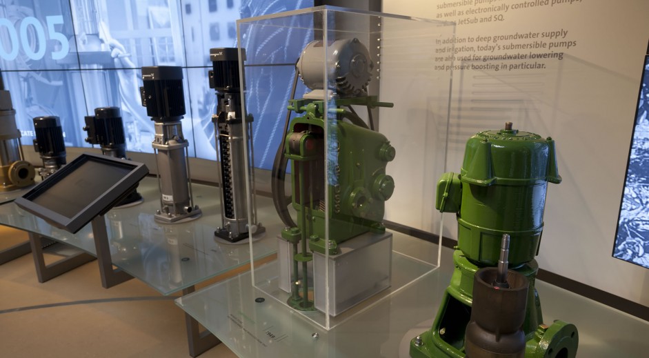 Kvorning har designet Brand Experience løsninger og meget avanceret AV, som formidler Grundfos’ familie- og industrihistorie og innovative produkter. Brand Experience er en skulptur i rummet med en vandskulptur i to etager midt i. En Grundfos-motor står bag.