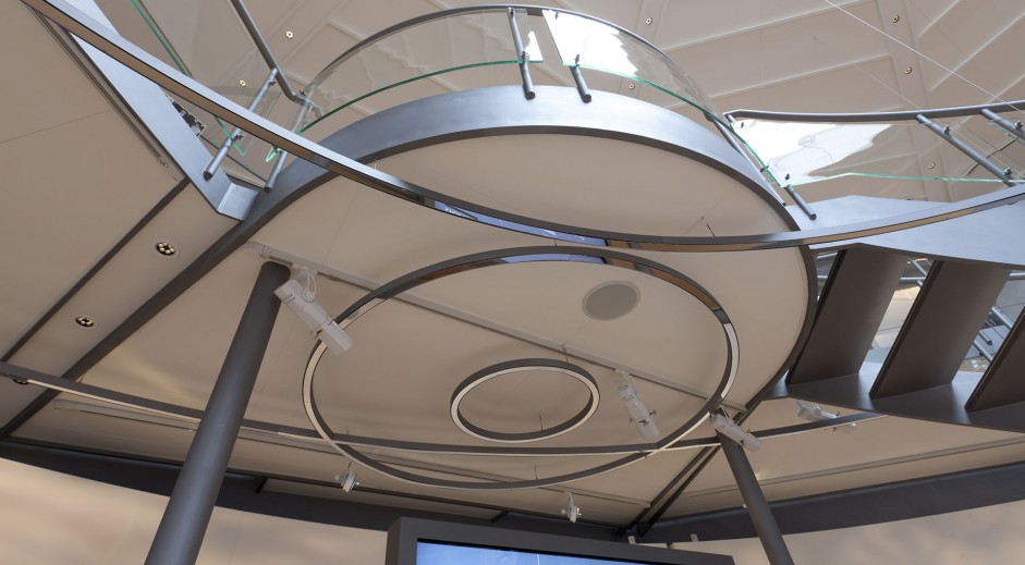 Grundfos Brand Experience breder sig ud i rummet i store, ringformede formationer – såkaldte ringe i vandet – fra vandinstallation i rummets midte. Design af grafik, møbler, bænke, poder og lys indgår i den rumlige skulptur.