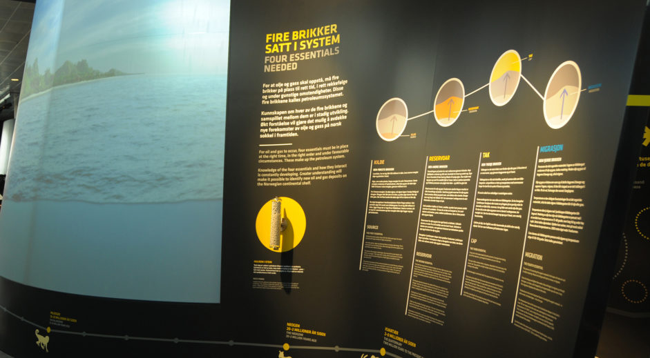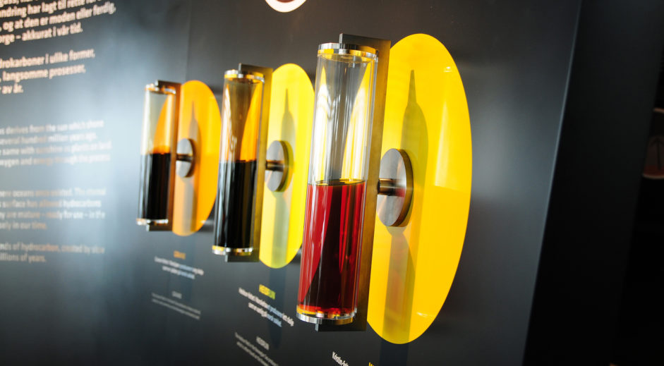 Formen er inspireret af olien og havet. To store, bølgende vægge står som en strøm gennem rummet og markerer et snit i det undersøiske og underjordiske. Når man bevæger sig ind imellem væggene, møder man et undervandsunivers med en 360 graders filmisk, fuld 3D-fortælling om oliedannelse med fakta og interaktive tilbud på væggenes yderflader.