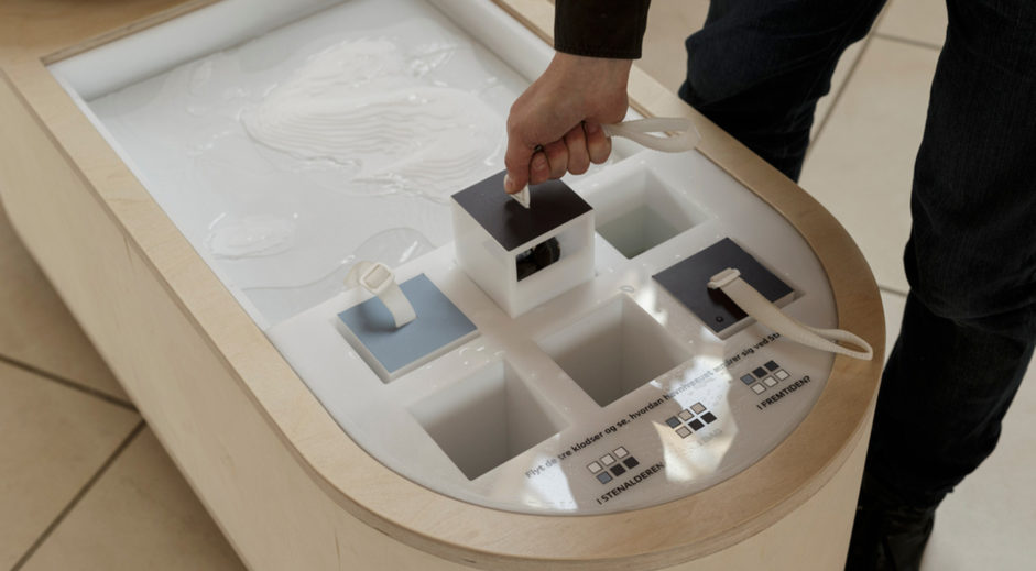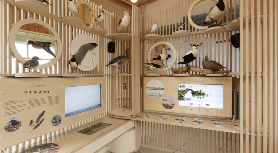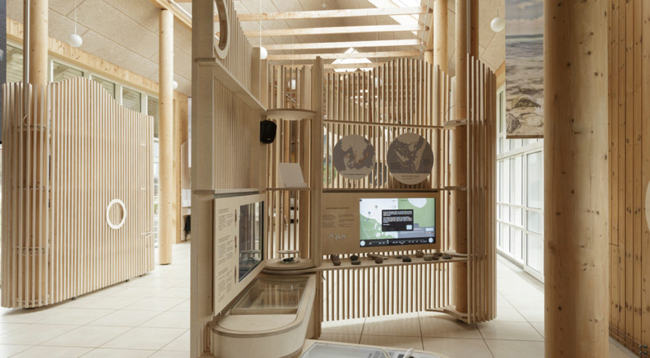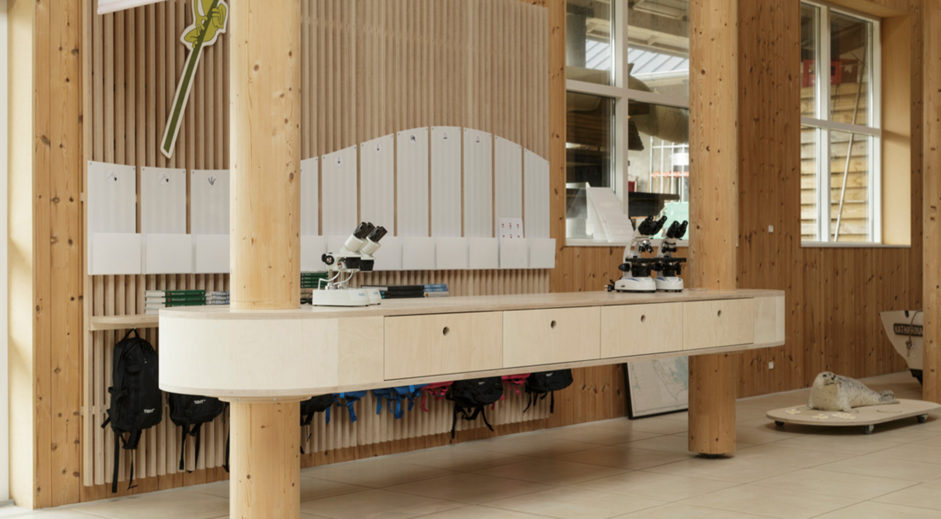 Ø-zonerne har skelet af krydsfinér efter smakkens spanteopbygning. Udvendig er de beklædt med flotte, lodrette trælameller. De kan skubbes sammen og ud til væggen på ingen tid. Print fra loftet kan blive hængende eller hejses ned via snoretræk ligesom et sejl.