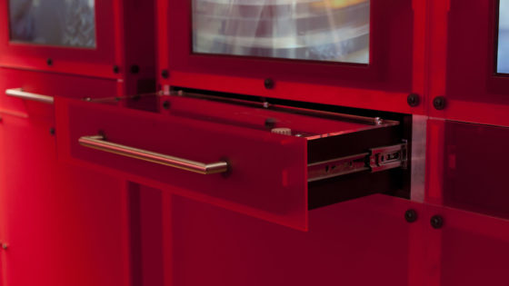 Ø-zonerne har skelet af krydsfinér efter smakkens spanteopbygning. Udvendig er de beklædt med flotte, lodrette trælameller. De kan skubbes sammen og ud til væggen på ingen tid. Print fra loftet kan blive hængende eller hejses ned via snoretræk ligesom et sejl.