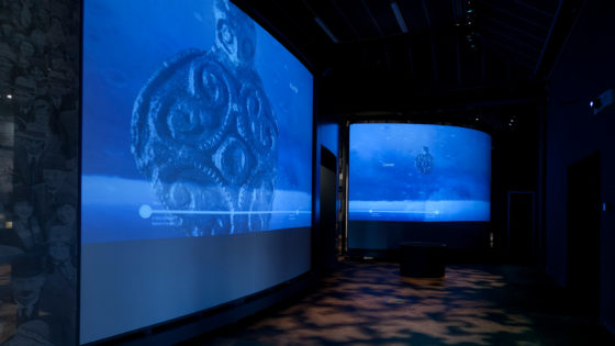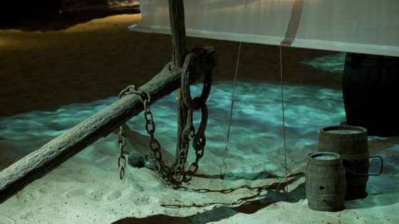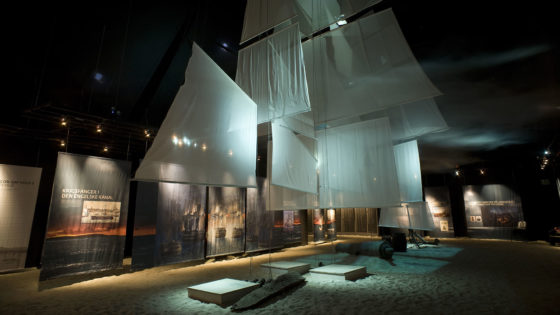 Midt i udstillingsrummet, der var etableret i museets gamle ladebygning, ‘svævede’ en kæmpestor fuldrigger som en flyvende hollænder på bunden af havet, komplet med kanon og anker i et sort rum fyldt med kanonrøg, ild, flimrende havvand og sand på “havbunden”.