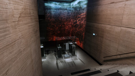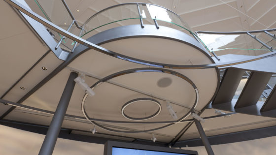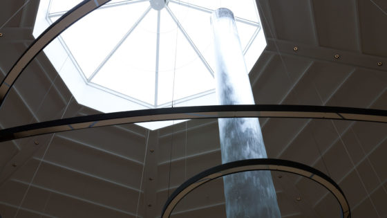 Kvorning har designet Brand Experience løsninger og meget avanceret AV, som formidler Grundfos’ familie- og industrihistorie og innovative produkter. Brand Experience er en skulptur i rummet med en vandskulptur i to etager midt i. En Grundfos-motor står bag.