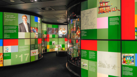 Halvvejs trækker et lys én ind et rum formet som det indvendige af en LEGO klods med en udstilling af årtiers LEGO modeller og æsker. Her er LEGO æsker som fysisk modeller eller i et interaktivt bord med over 5.000 æsker.