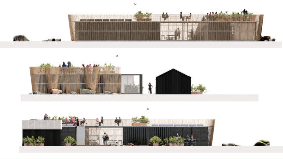 Huset bygges af seks containere, som lægges sammen til ét rum. På to sider bliver det omgivet af en bølge af lærketræ, som med tiden vil tage farve af vind, vejr og hav.