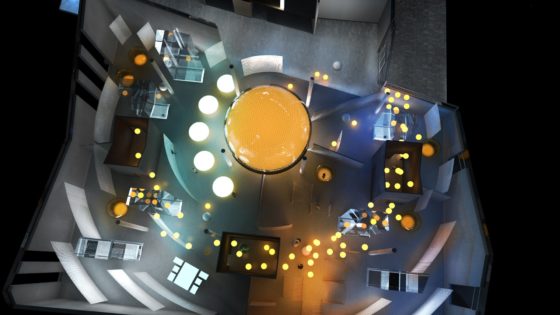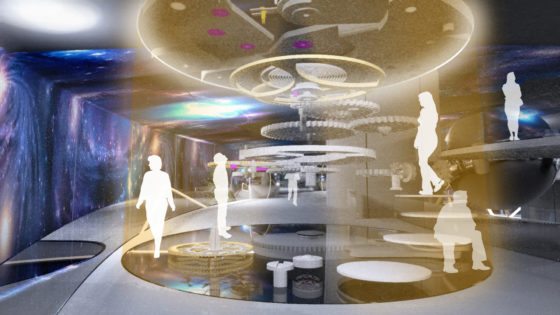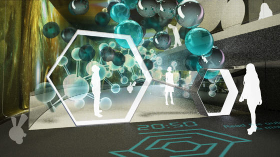 Formen er inspireret af olien og havet. To store, bølgende vægge står som en strøm gennem rummet og markerer et snit i det undersøiske og underjordiske. Når man bevæger sig ind imellem væggene, møder man et undervandsunivers med en 360 graders filmisk, fuld 3D-fortælling om oliedannelse med fakta og interaktive tilbud på væggenes yderflader.